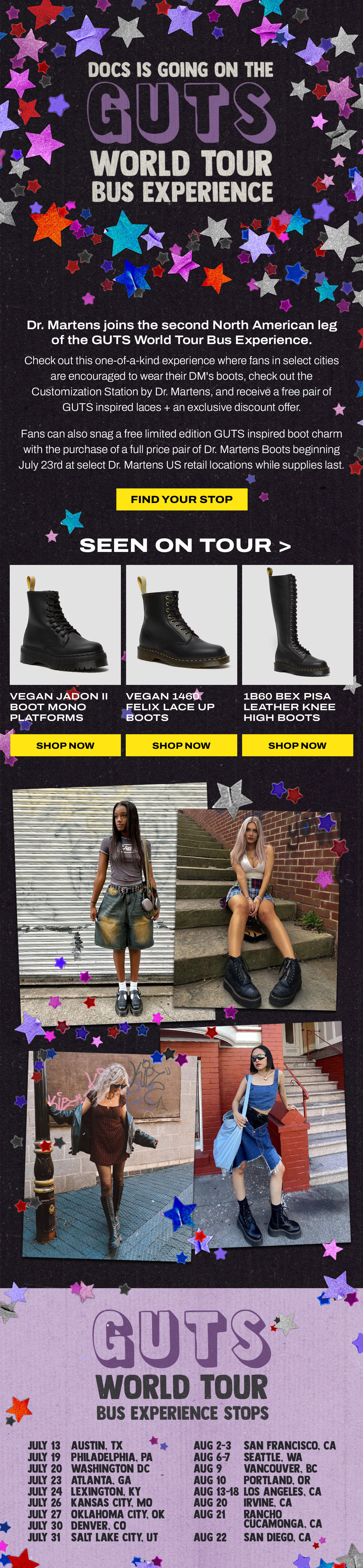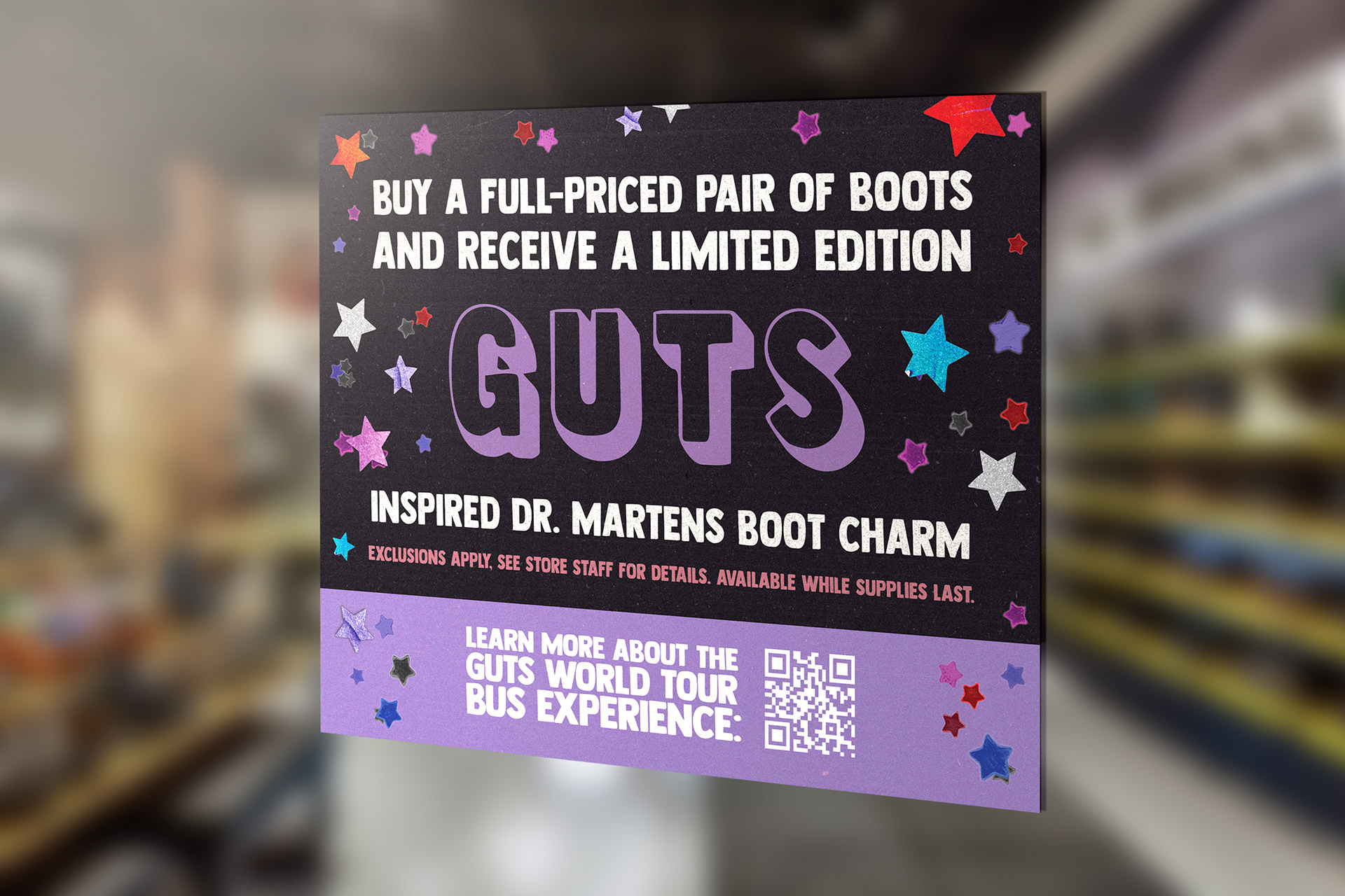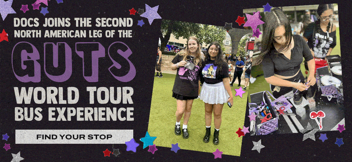 When the second GUTS World Tour was announced, Dr. Martens partnered with Olivia Rodrigo on the road and activated at 17 tour stops with a full Customization Station takeover with limited edition boot charms, laces, and other accessories for their Docs.