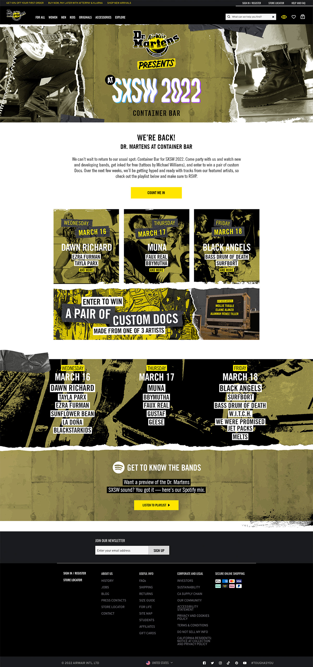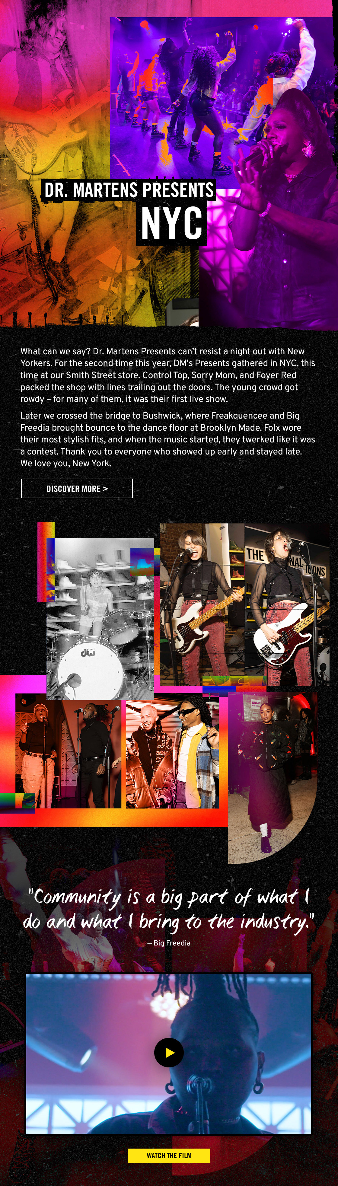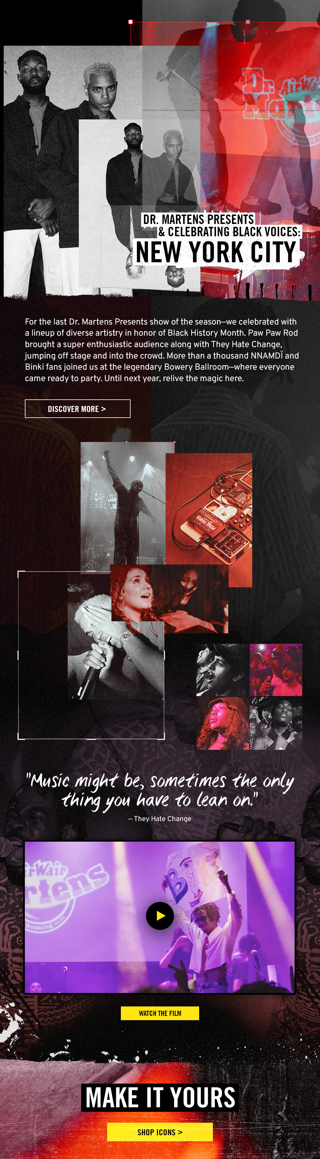Every part of Dr. Martens marketing lit up around the event, from teasers and RSVPs leading up to it, to live updates during, and recap coverage after. Social, web, email, ads, PR placements, print, and environmental all came together to bring it to life, and I played a central role across it all.