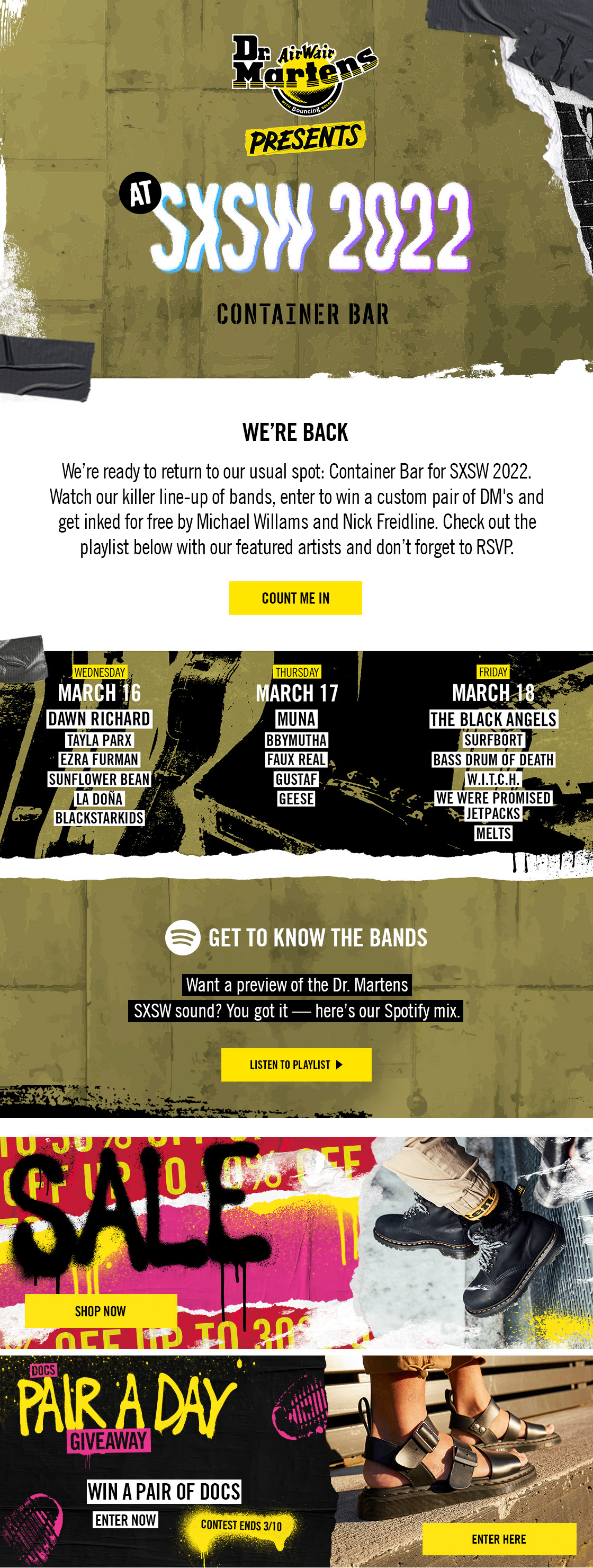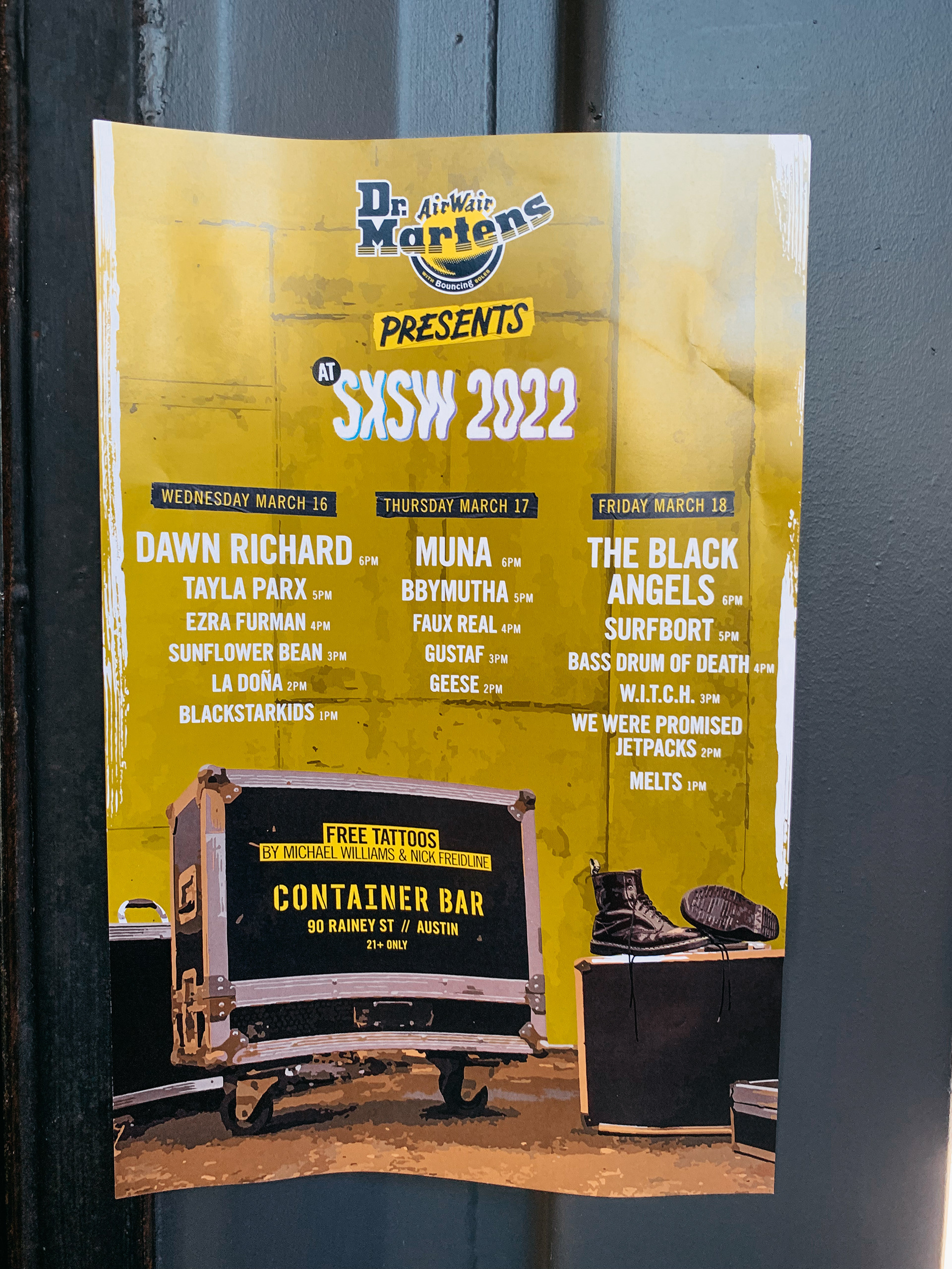 For South by Southwest in Austin, Dr. Martens took over the Container Bar on Rainey Street, hosting a concert series with a highly anticipated lineup of 17 artists and bands. Music is at the core of the brand, so showing up at SXSW felt like a natural extension of that.