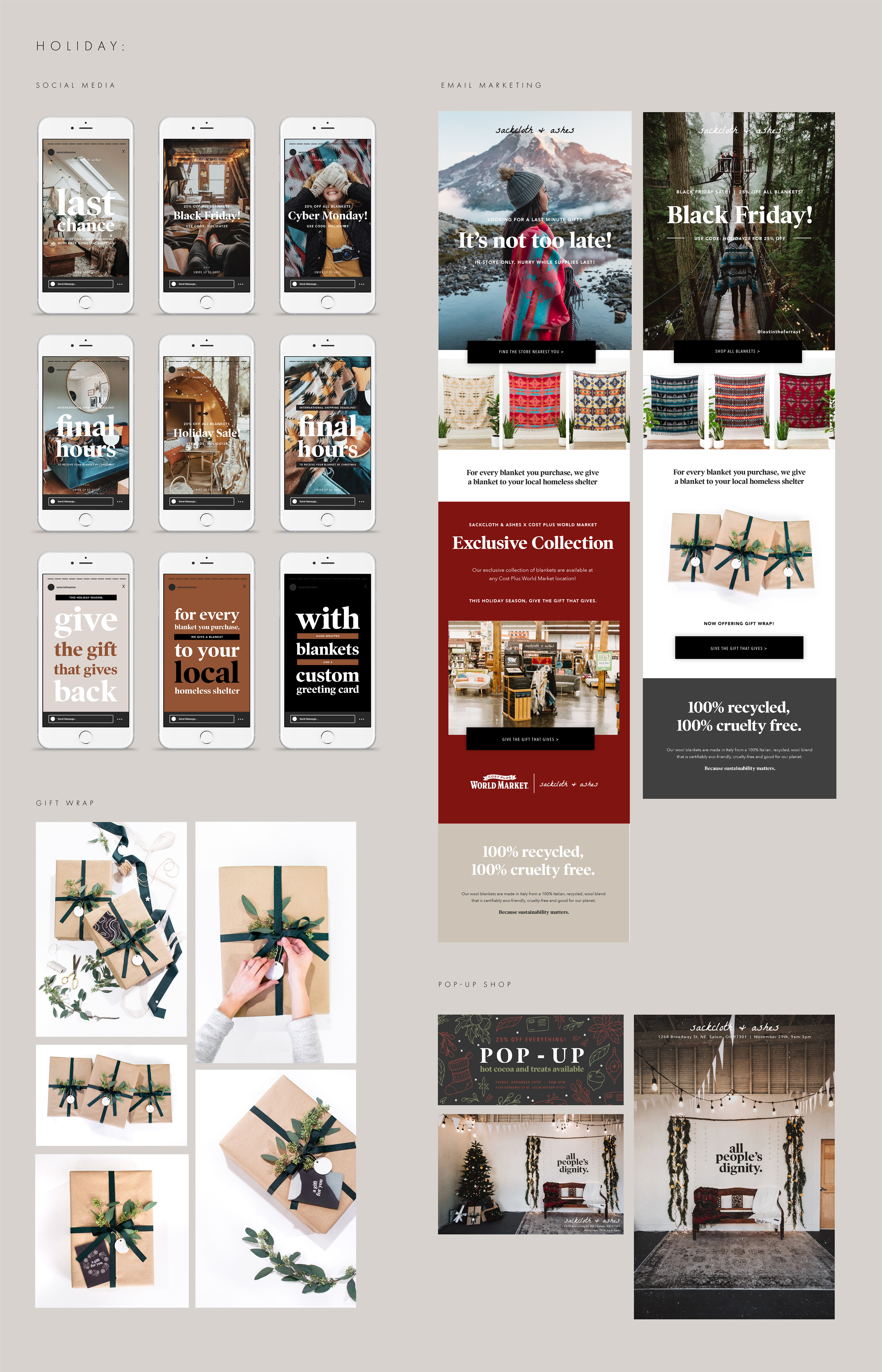 Sackcloth & Ashes regularly launched seasonal campaigns to stay relevant and consistently provide fresh content to its audience. I led the creative direction for these campaigns and created assets across email, social media, packaging, and retail, ensuring each launch felt cohesive, engaging, and aligned with the brand.