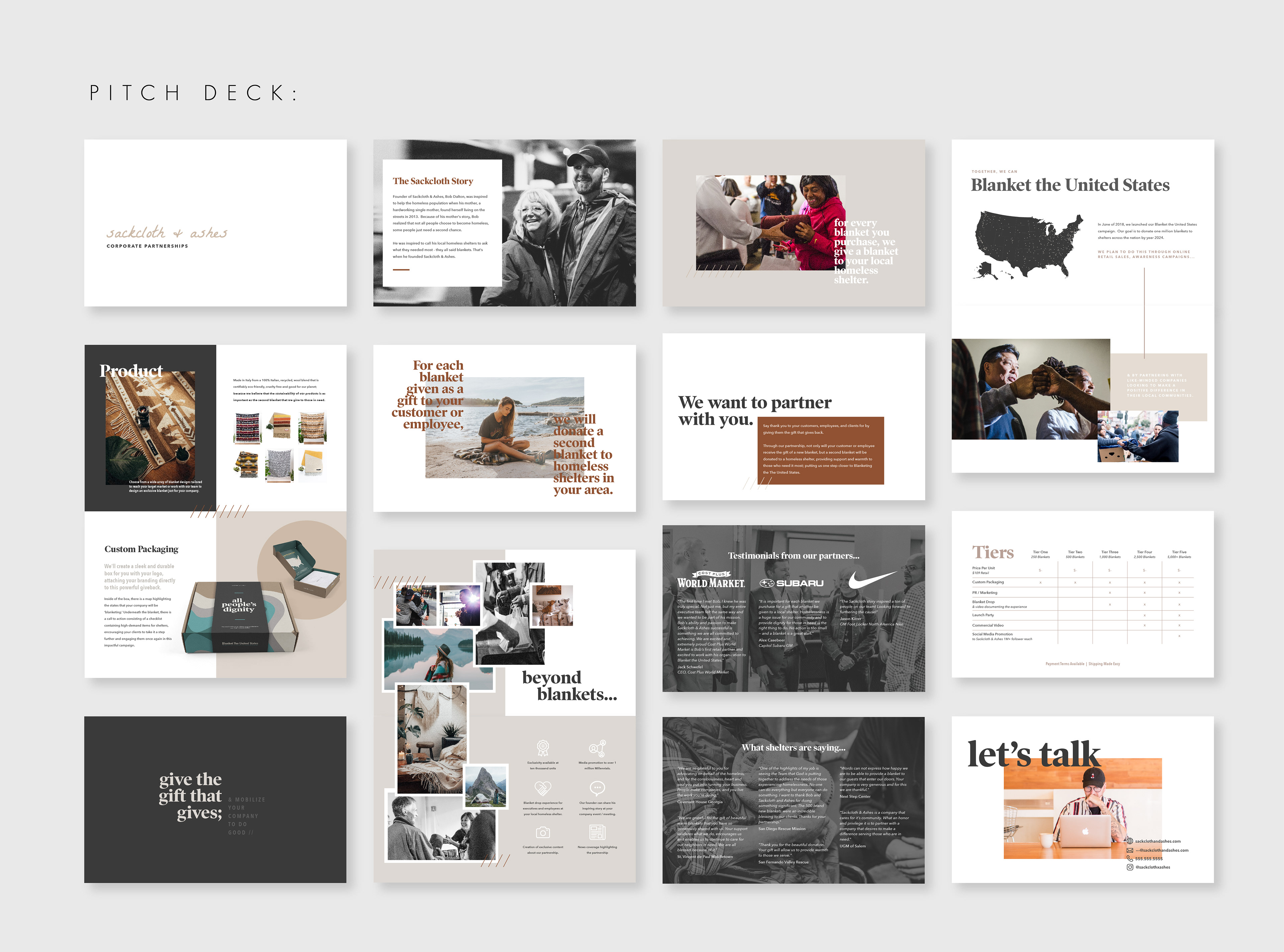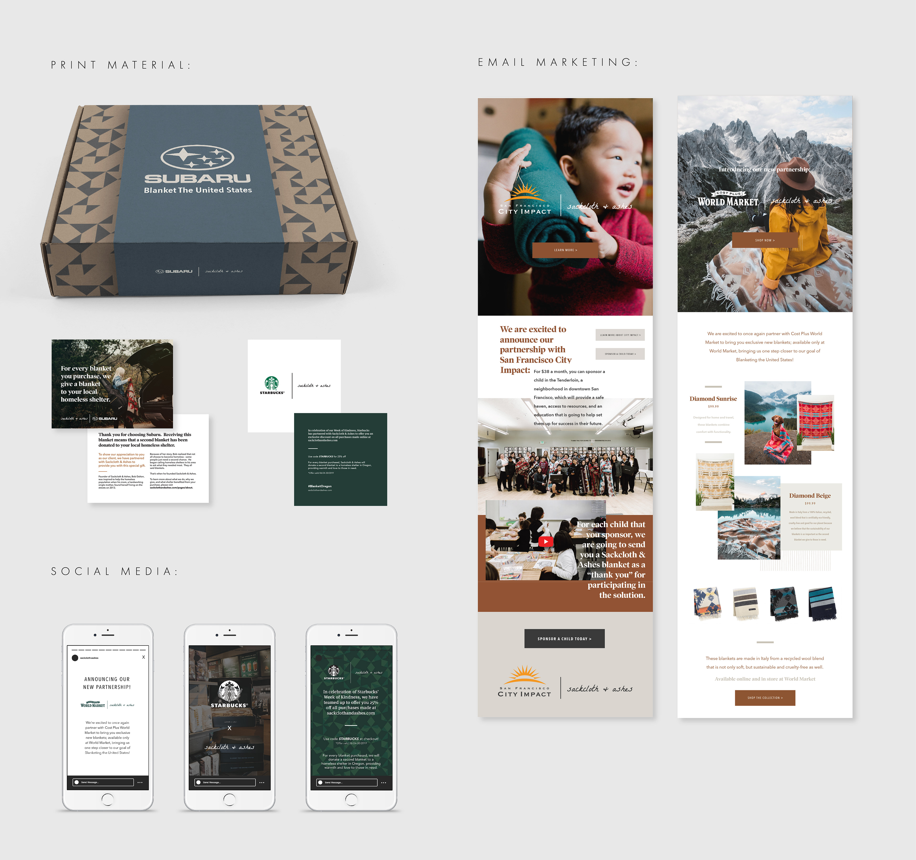 In addition to direct-to-consumer and retail efforts, a significant portion of Sackcloth & Ashes’ growth came from business-to-business partnerships. During my time there, I led and supported the visual direction of pitch decks, brand partnerships, and corporate campaigns across a wide range of collaborators, including Starbucks, Cost Plus World Market, Subaru, Nike, Dutch Bros, Bradley Mountain, Anderson Windows, Deacon, Fidelity Mortgage, Pura Vida, and Square. These partnerships resulted in co-branded packaging, marketing campaigns, and custom product collaborations.
