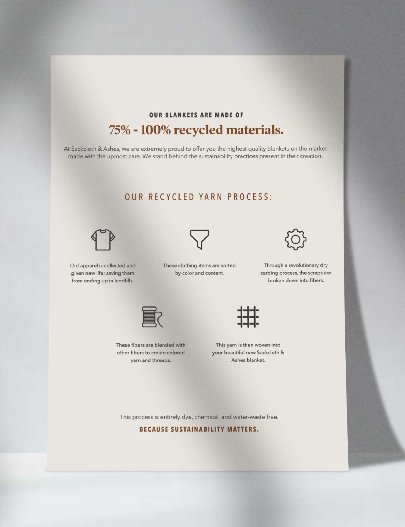 When S&A’s founder, Bob Dalton, learned his mother had become homeless, he began calling shelters to ask what they needed most. The answer was simple: blankets. Sackcloth & Ashes was born from that moment, donating one blanket to a local shelter for every blanket purchased.